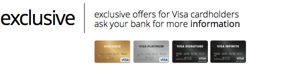 Offer valid 5 May 2014 through 31 December 2014, subject to availability. This offer cannot be exchanged for goods or cash and is not valid in conjunction with other promotions. Offer only valid for Visa cardholders when paying with their Visa Platinum/Signature/Infinite card. Void where prohibited, taxed or restricted by law. Purchaser must pay any applicable taxes and fees. Offer redemption and fulfilment is solely the responsibility of the merchant making the offer. Visa International reserves the right to modify or cancel any or all of these offers at any time and without notice. For more information on this and other Visa Platinum privileges, visit www.visamiddleeast.com. |